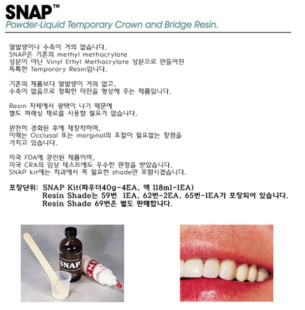 - SnapÀº Crown, Bridge, Inlay ¹× Onlay¸¦ À§ÇÏ¿© ÁغñÇÑ Ä¡¾Æ¸¦ Àӽ÷Πµ¤µµ·Ï µÇ¾î ÀÖ´Â »õ·Î¿î ÀÚü °æÈÁ¦